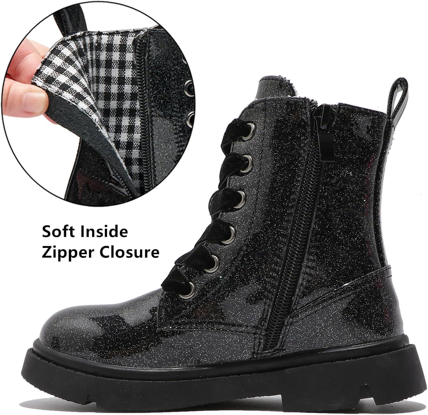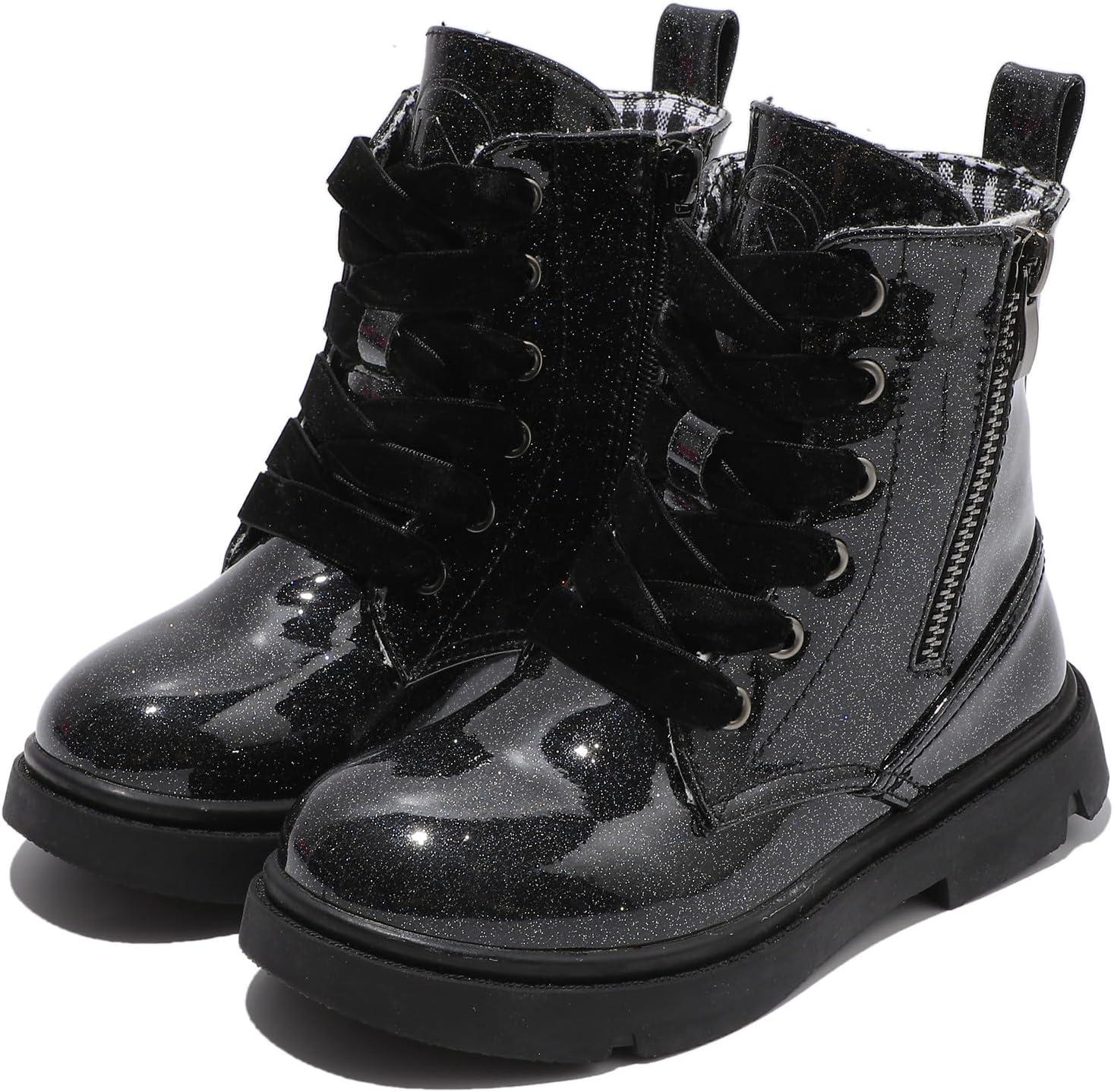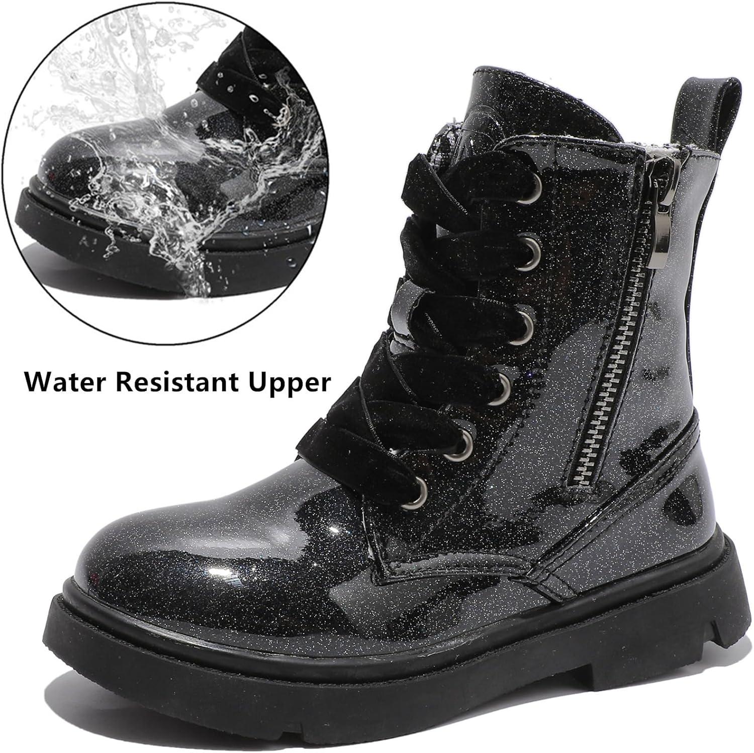 DADAWEN Boys Girls Glitter Ankle Boots Kids Lace Up Waterproof Combat Shoes With Side Zipper for Toddler/Little Kid/Big Kid(Black)