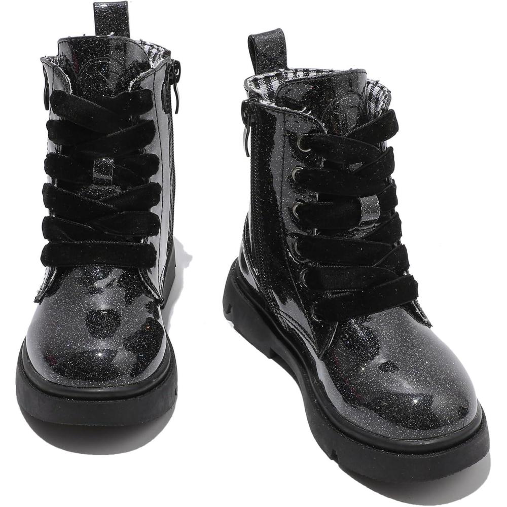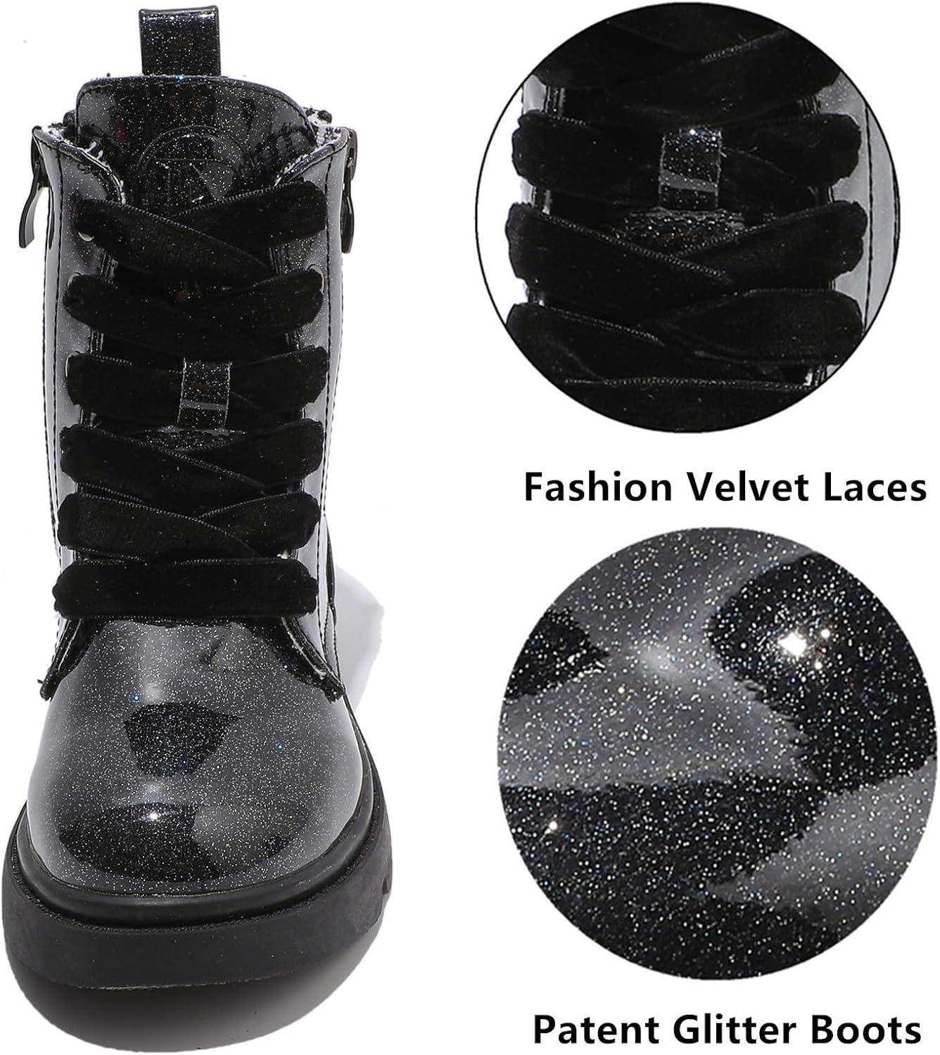 DADAWEN Boys Girls Glitter Ankle Boots Kids Lace Up Waterproof Combat Shoes With Side Zipper for Toddler/Little Kid/Big Kid(Black Glitter)