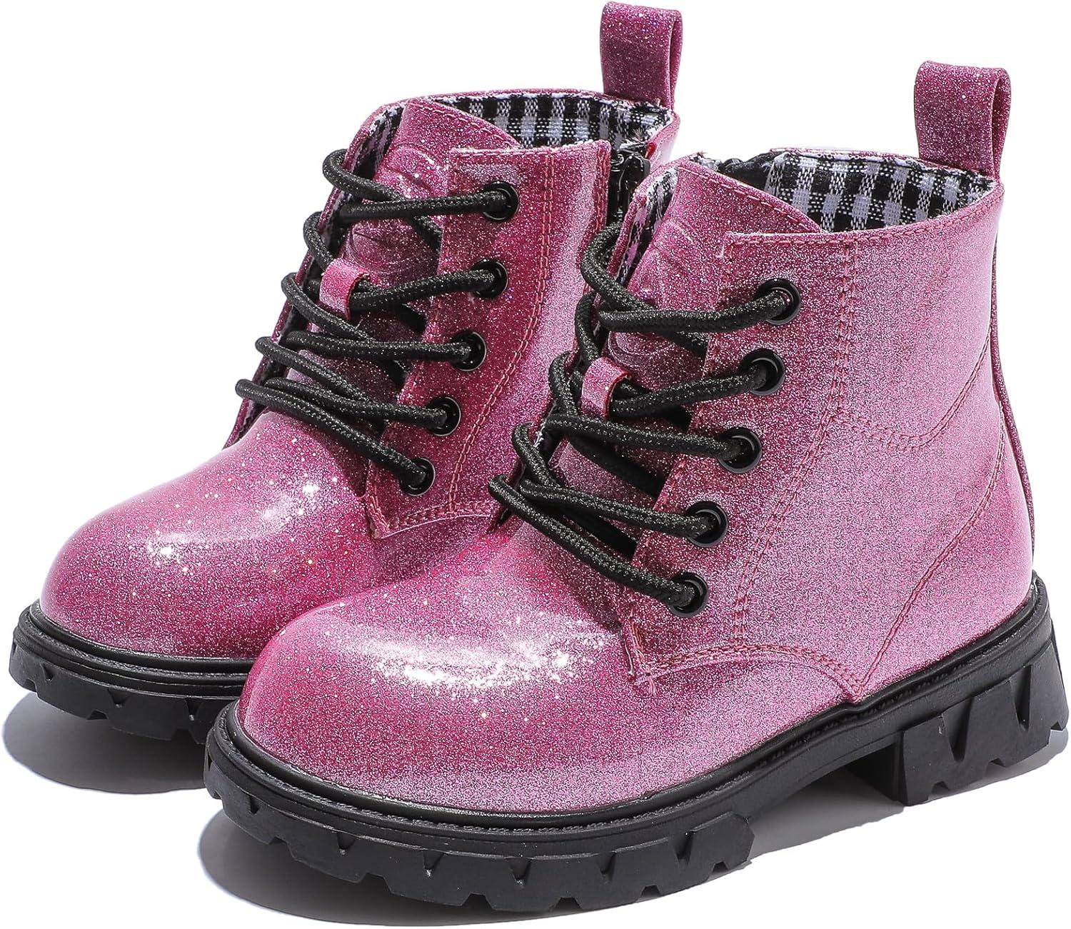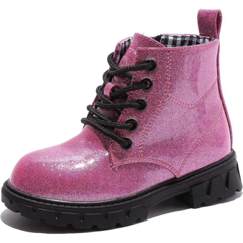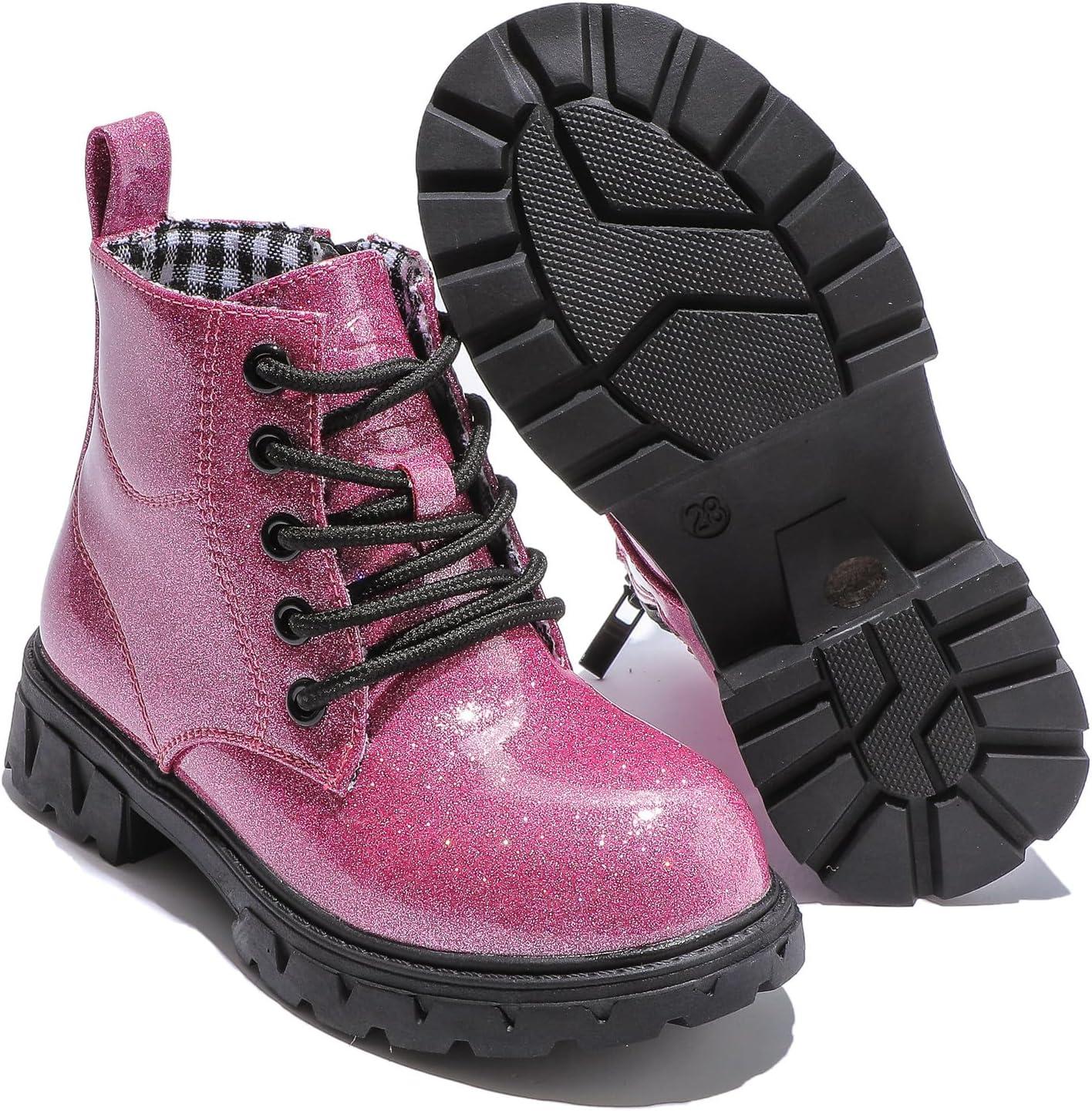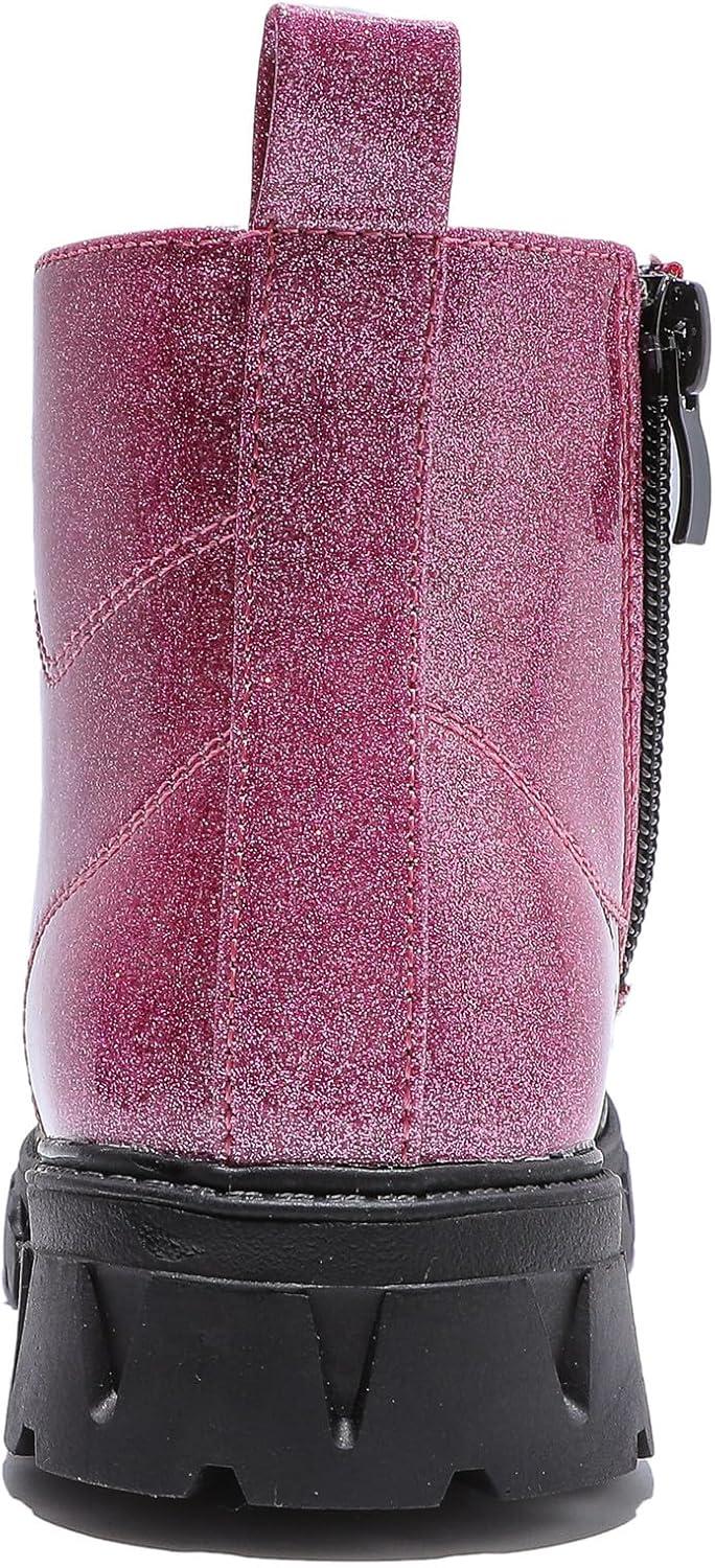 DADAWEN Boys Girls Glitter Ankle Boots Lace Up Waterproof Combat Shoes With Side Zipper for Toddler/Little Kid/Big Kid(01 Hot Pink/Glitter)