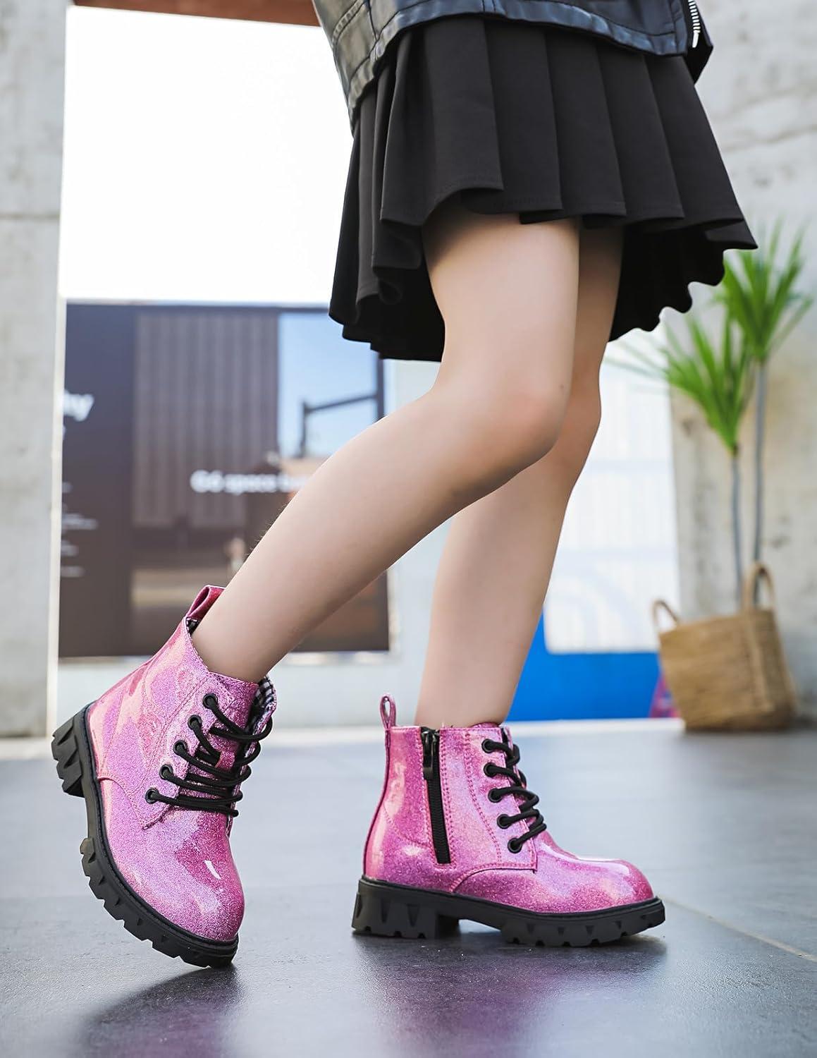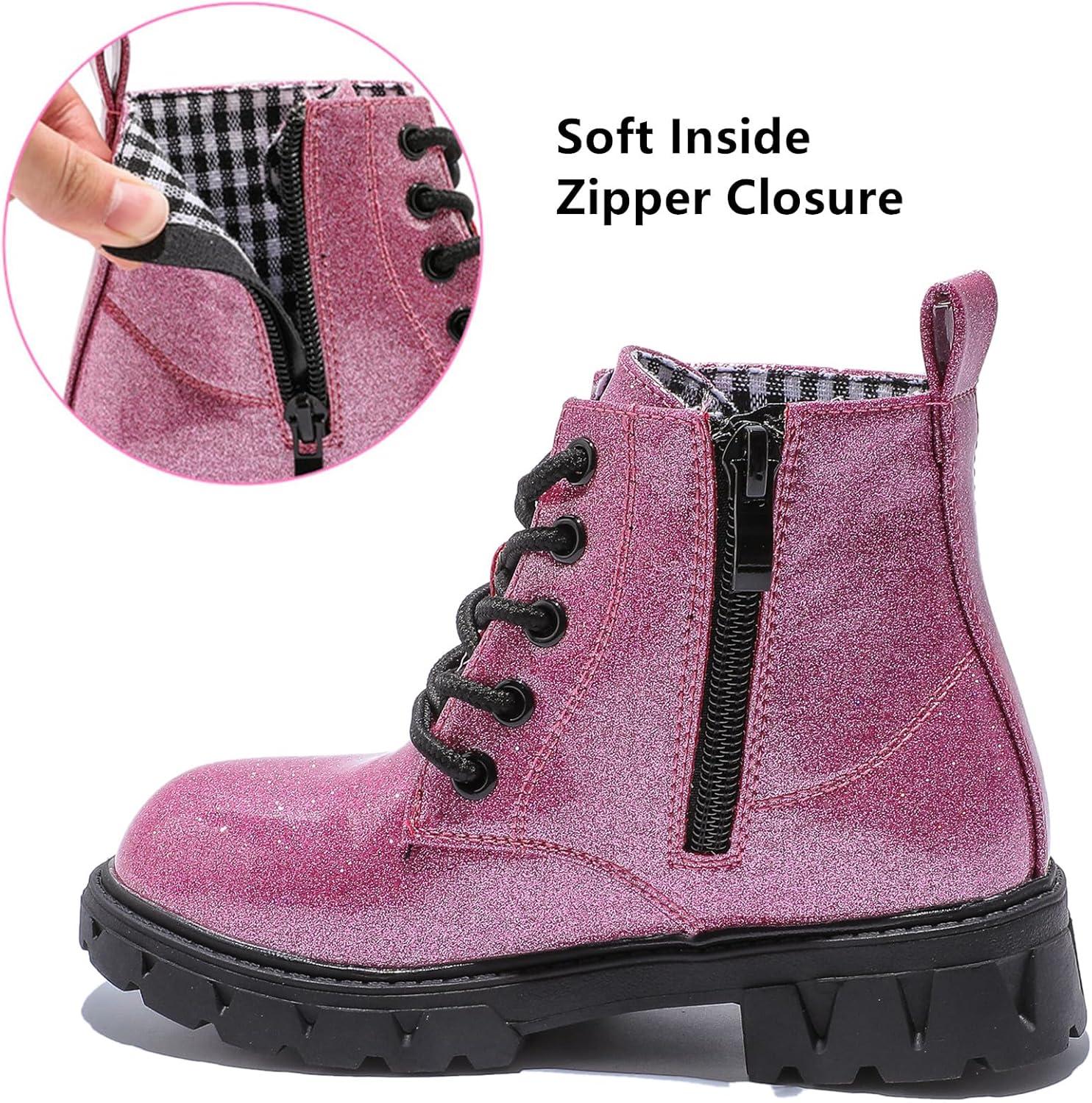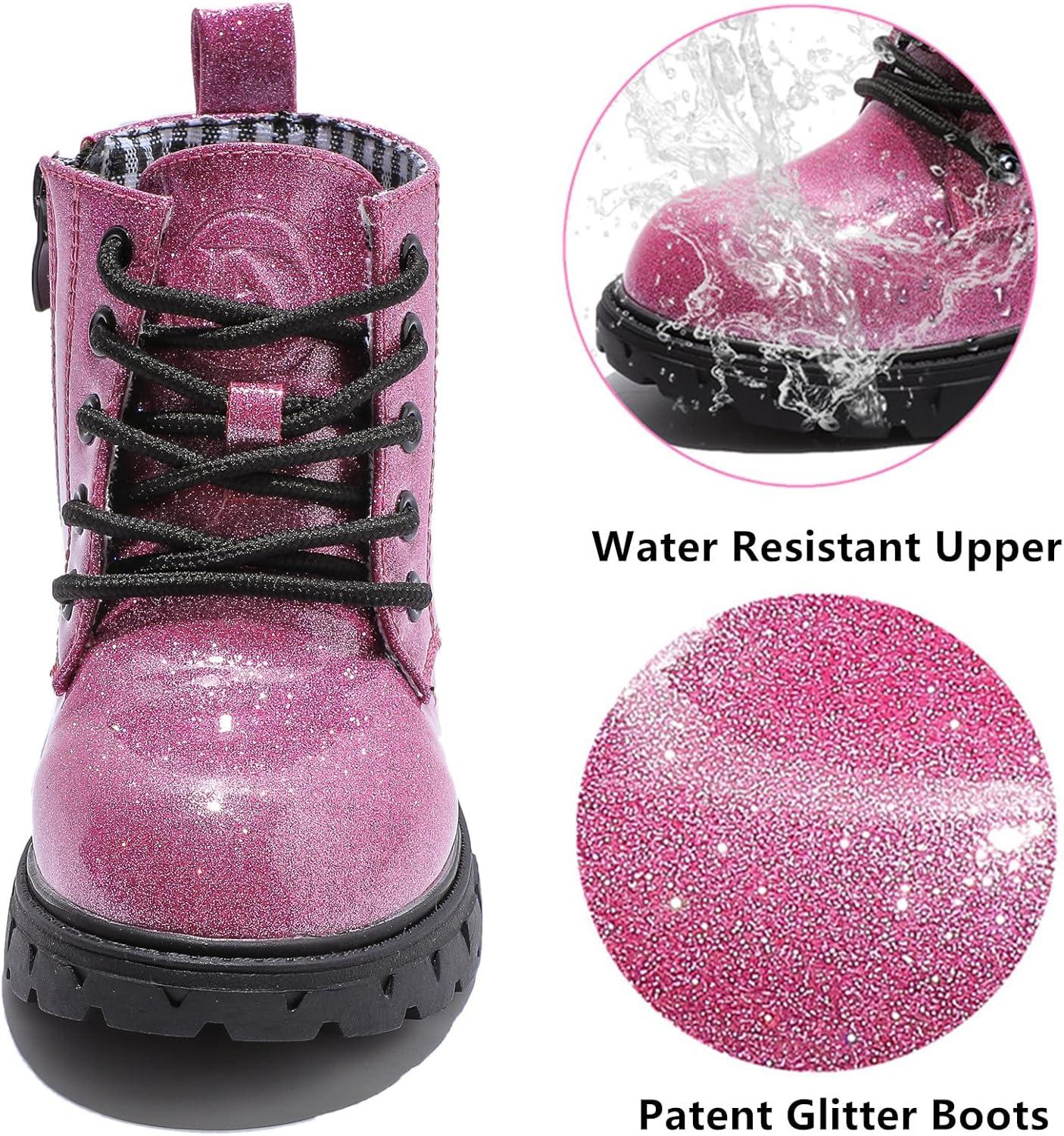 DADAWEN Boys Girls Glitter Ankle Boots Lace Up Waterproof Combat Shoes With Side Zipper for Toddler/Little Kid/Big Kid(01 Hot Pink/Glitter)