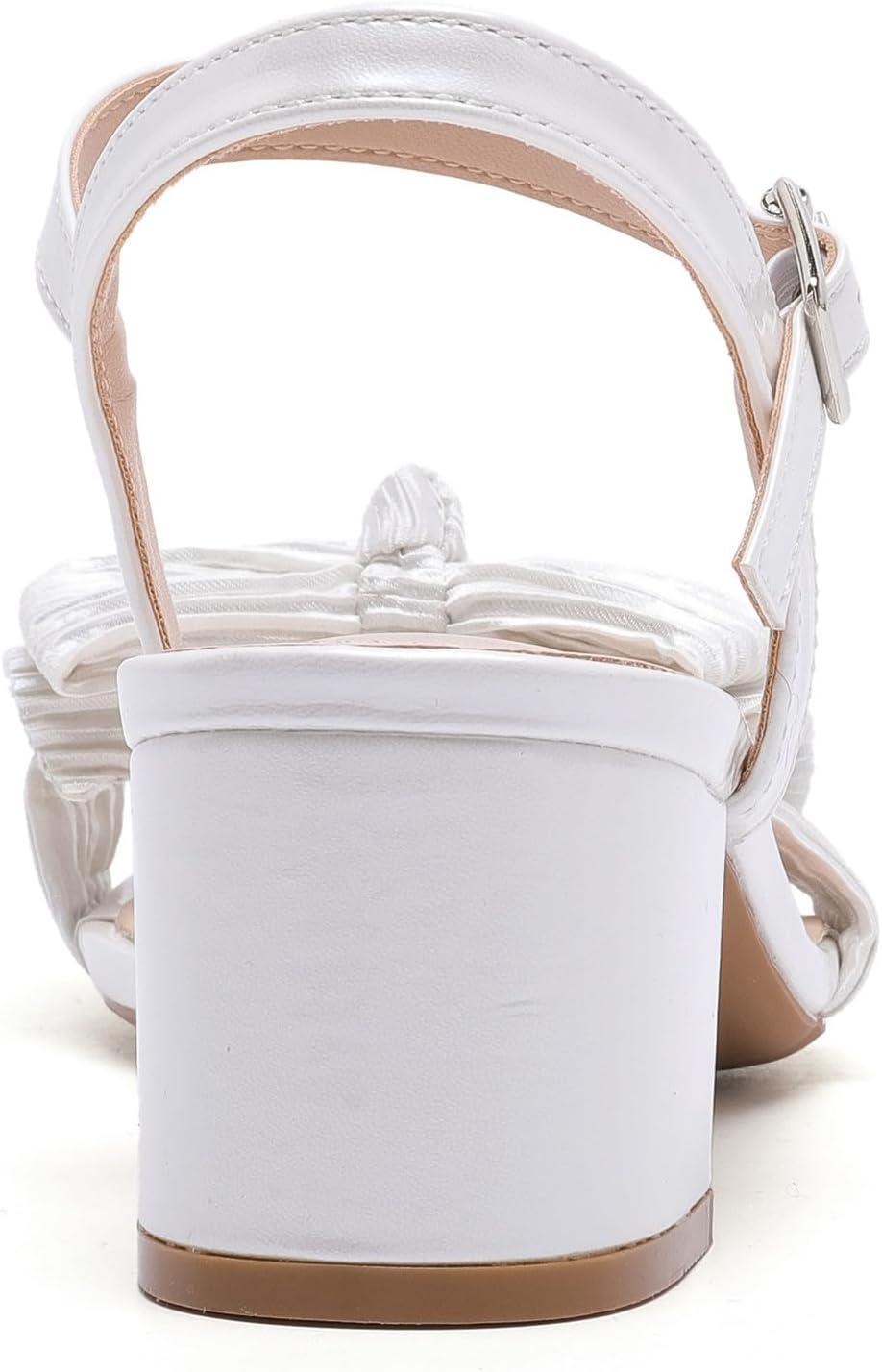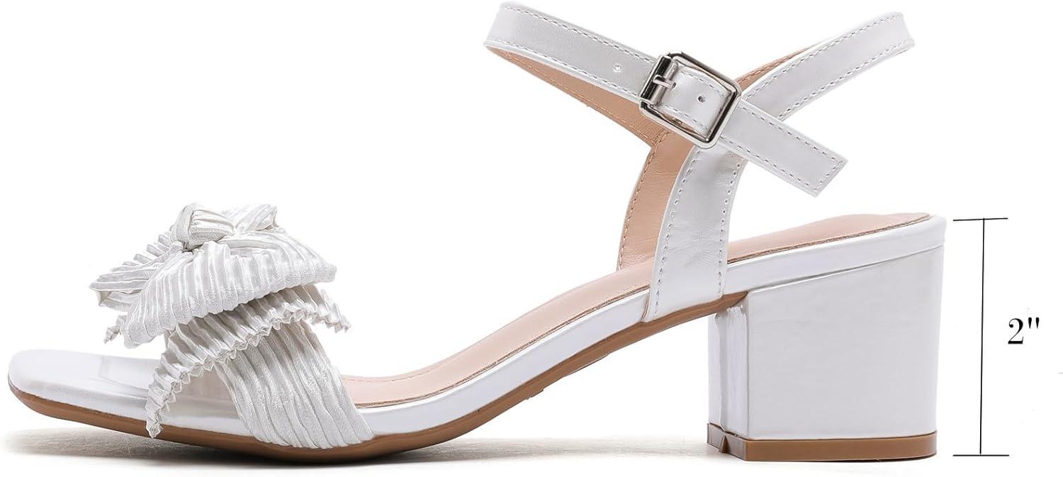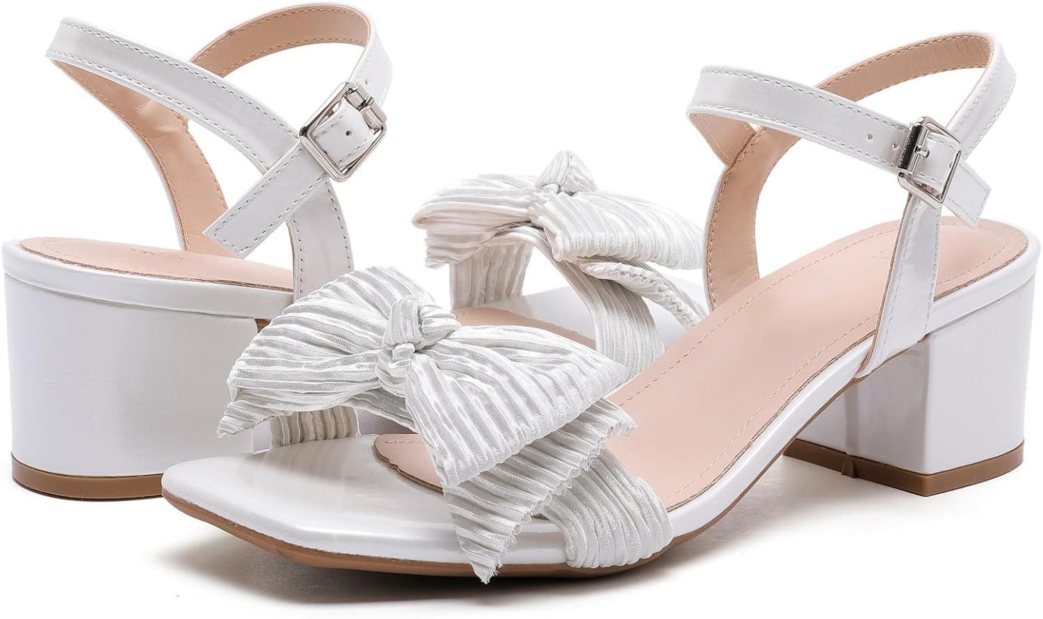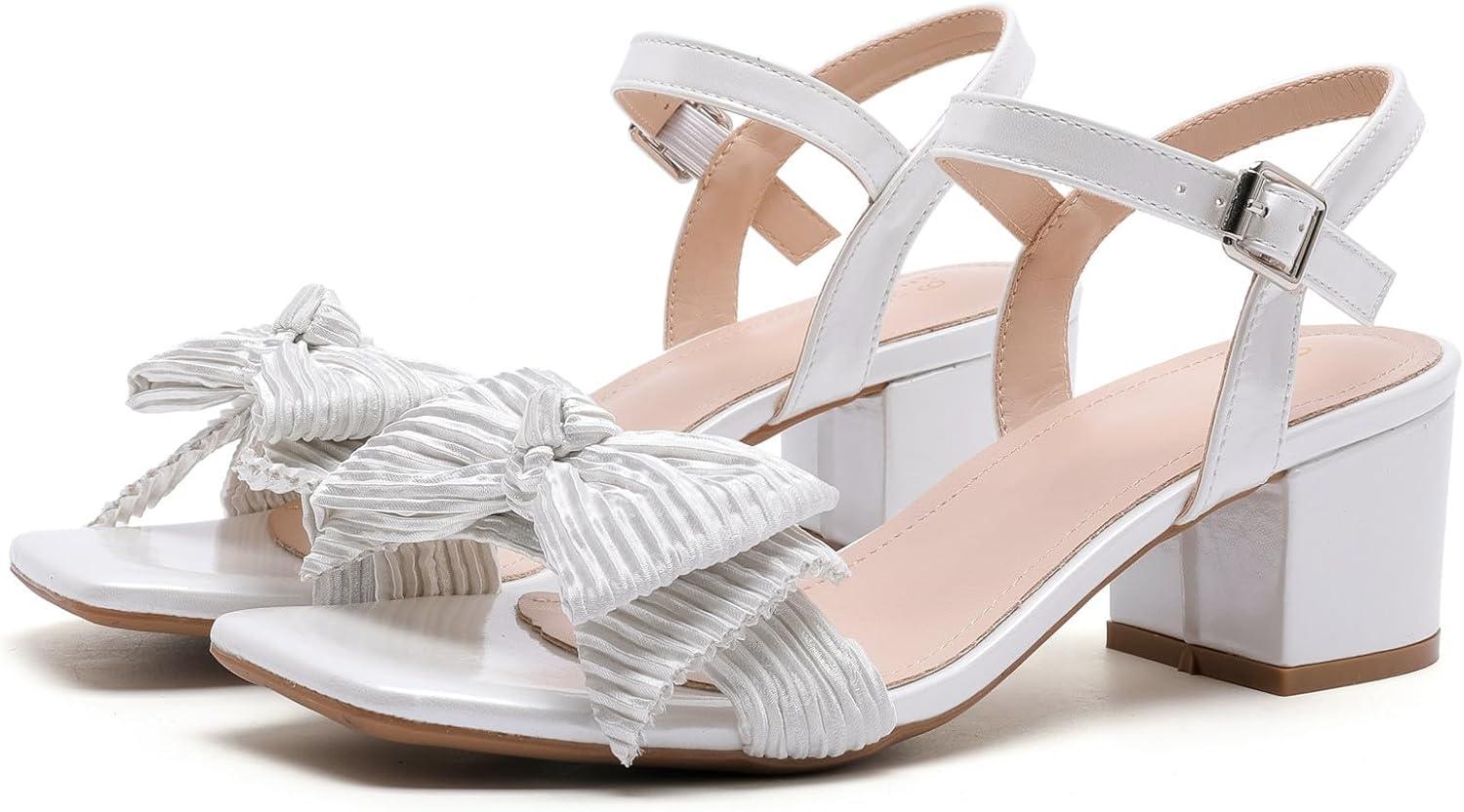 DADAWEN Women’s Bow Heels Sandals Chunky Low Heels Open Square Toe Dressy Shoes Ankle Buckle Strap Sandals for Party Wedding(White)